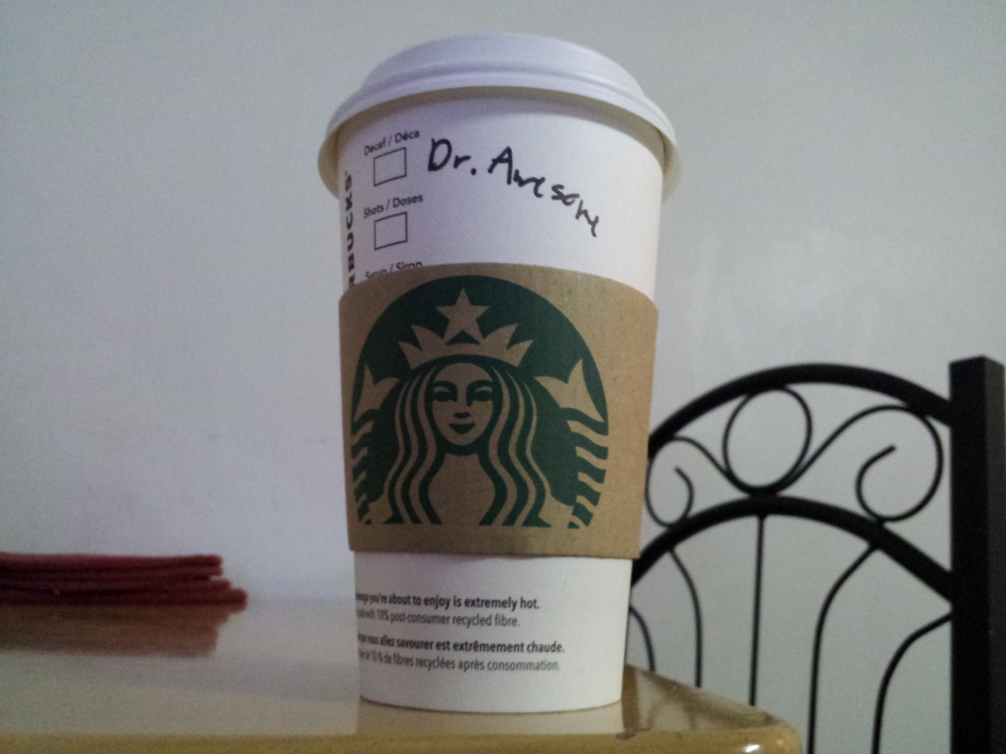 The other day, I passed by at the usual location and for the first time, the barista asked me for a name to put on the cup. I didn't want to use my real name and I thought I'd mix it up a bit this time. The first thing that came to my mind was... well... Dr. Awesome. She laughed and I just went along with it. Then I got my order and realized she didn't really put the whole name. Instead, she just wrote, 'DR.'. I figured that perhaps long names were frowned upon because shorter ones are easier and faster to write. So I let it go but of course wished that my cup had the name I provided. But it was no big deal. I was in a good mood and thought I'd be funny a bit. I came back one more time and she put the name again, but didn't really spell the name properly. It was funny and it reminded me of when Metallica had a sheet stand that had 'METLLICA' on it or James Hetfield's guitar with the 'Eet Fukk' letterings on the body.